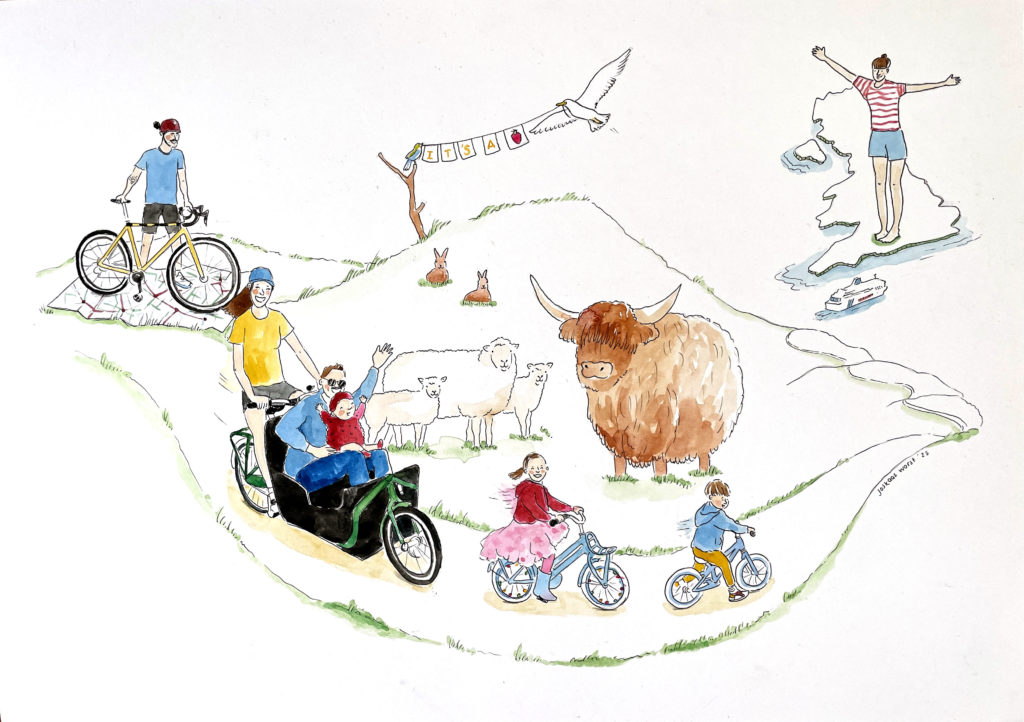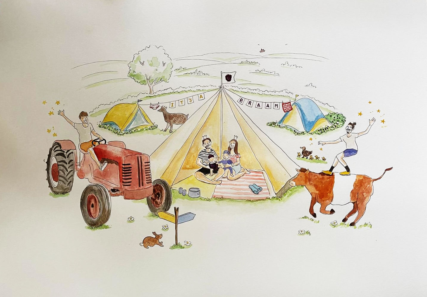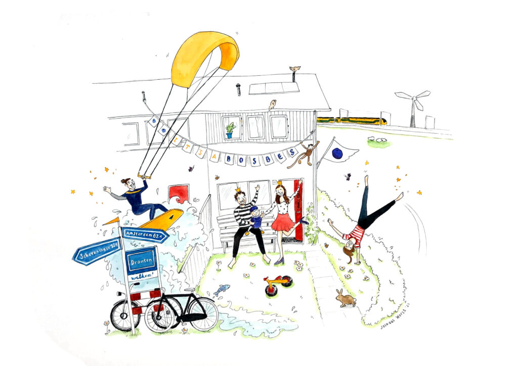 Oom Paul (de surfer links) en tante Marieke (de radslag rechts) wilden hun pasgeboren nichtje een bijzonder cadeau geven: een speciaal voor haar gemaakte illustratie waarin verschillende elementen uit haar leven samenkomen.